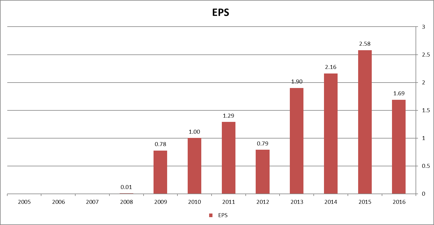 まずは、EPSから。2012年に一度、利益を落としていますが、後は着実に成長しています。