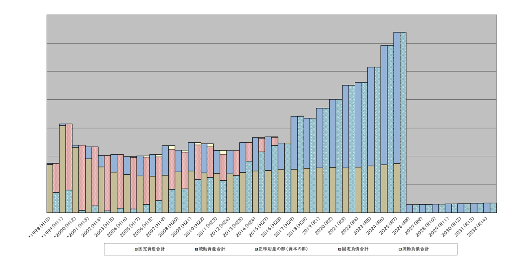 左側の青色の棒が流動資産、茶色の棒が固定資産。右側の黄色い棒が流動負債、赤い棒が固定負債、緑の棒が純資産です。