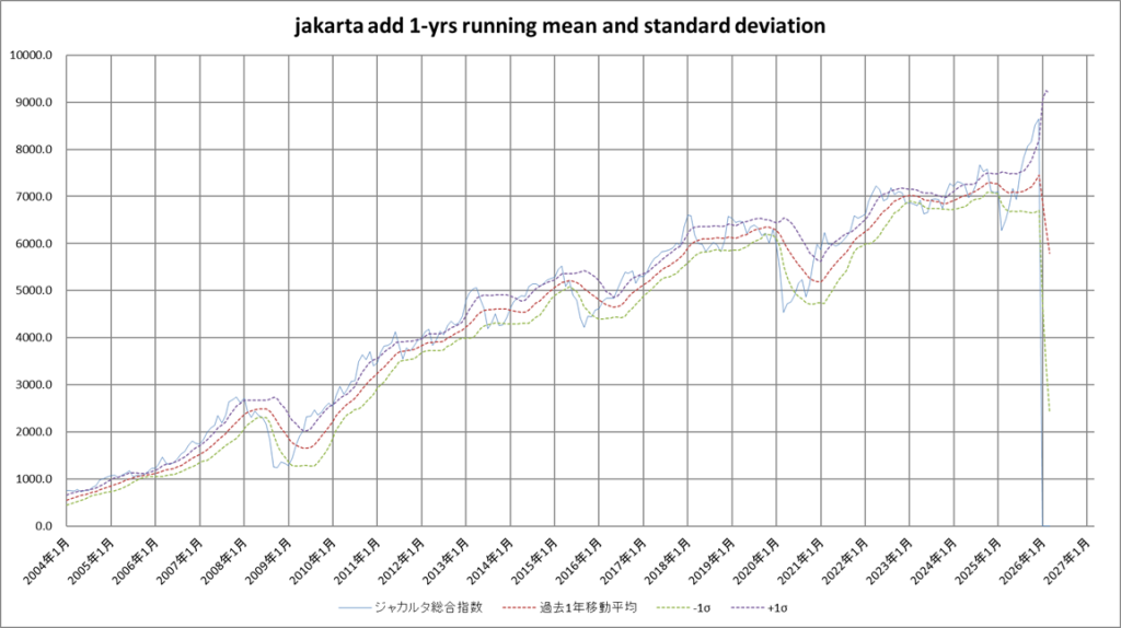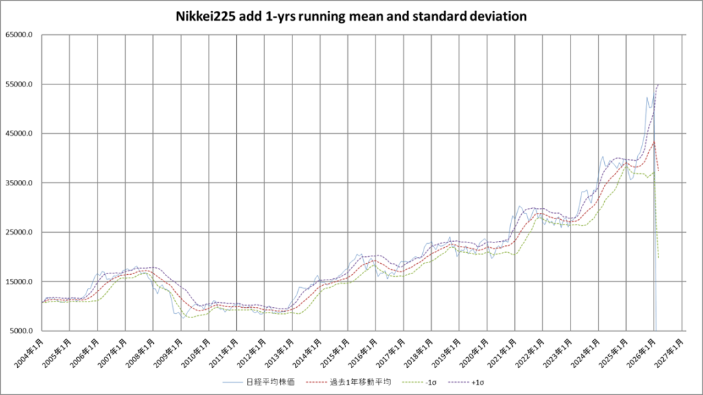 各国市場の平均株価のグラフについて、過去1年の標準偏差(1σ)の幅を図示します。この約68%の幅を参考にし、現在の株価水準を把握します。大きく下振れしている場合は、バーゲンセールの購入チャンスであると把握します。